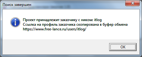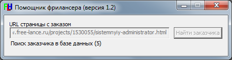 ![]() Хорошо, если Вы имеете там аккаунт Pro. В противном случае Вы можете оставлять свое предложение только в одной своей специализации, которую можно поменять лишь раз месяц. Также Вам доступны только 5 предложений в месяц. Но бывают случаи, когда Вы находите интересное предложение, которое Вам под силу, но из-за описанных ограничений Вы не можете на него откликнуться. Я сталкивался с этим не раз, поэтому придумал, как находить ник работодателя интересующего меня заказа, чтобы связаться с ним напрямую. Для оптимизации данного поиска я написал простую программу "Помощник фрилансера" или FLHelper: ![]() Для ее использования Вам нужно скопировать в соответствующее поле URL страницы с заказом (например, https://www.free-lance.ru/proj... stiki.html) и нажать кнопку "Найти заказчика". Поиск может занять продолжительное (даже очень!) время, но в конце Вы получите результат: ![]() В буфере обмена окажется ссылка на профиль найденного заказчика, которую Вы можете легко открыть в любом браузере. Программа не требует установки. Данная версия не требует наличия дополнительных библиотек, использует сетевую базу данных. Все желающие могут скачать "Помощник фрилансера" отсюда. Жду предложений и замечаний. Update: Из-за отсутствия актуальности работы приостановлены.