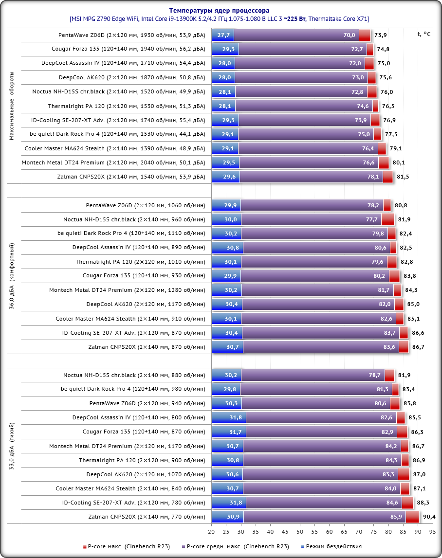 7950Х - дорогой, порядка 58 т.р. Это мне сейчас не по карману. Но я смотрел не заявленные параметры, а параметры в ходе тестов. С этими характеристикам разобраться не просто. Сейчас вспомню что там было. Добавлено через 19 минут У хороших кулеров при теплоотводе порядка 220 Вт шум порядка 38 ДБ. Это не тихо. Но и не турбина самолета. Граница условного комфорта 36 ДБ. С шумом многое определяется условиями измерений. Или опытом эксплуатации. У меня мощных кулеров не было. Сейчас посмотрел на данные солидного обзора по кулерам и увидел,что там явная путаница с измерениями шума. Мда. Имею ввиду вот это обзор https://www.tomshardware.com/p... -cooling/2 если посмотреть на таблицу мощности отводимого тепла при уровне шума равно 38,2 Дб (а это порядка 220 Вт отводимой мощности тепловой) и на таблицу уровня шума при отводе 175 Вт, то видно противоречие - в последней уровень шума многих кулеров превышают 38,2 Дб. Путаница. Добавлено через 4 минуты При тесте при 175 Вт (тот же обзор) лучшая воздушка имела шум 37-38 ДБ, а водянка была явно шумнее. Добавлено через 17 минут Добавлено через 3 минуты Добавлено через 12 минут liris, вот неплохие сводные данные по шуму при отводе тепла 225 Вт (это с запасом для 14500) Видно, что в тихом режиме кулера (шум до 35 ДБ) температура процессора вполне допустимая - 83 градуса https://o.dns-shop.ru/original... 2b5707.png Это из обзора https://club.dns-shop.ru/revie... r-luchshe/ Добавлено через 1 час 39 минут Честно говоря, меня интересует сейчас больше всего материнская плата. Если есть соображения - буду благодарен.