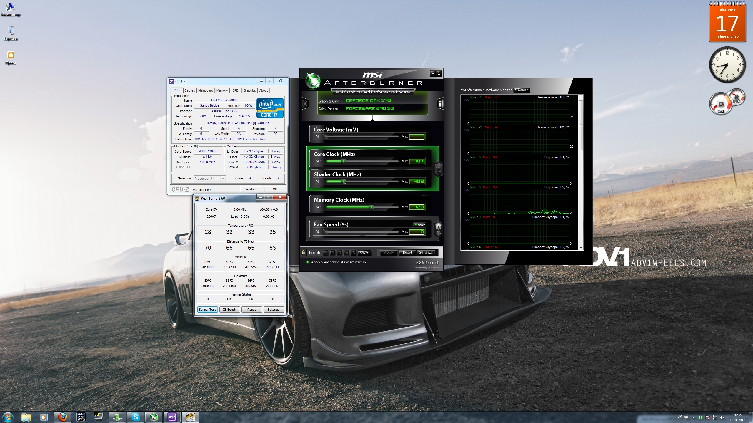 Система : Процессор:Intel Core i7-2700K 3.5GHz Материнская плата:ASUS LGA1155 MaximusIV Extreme-Z Z68 Видеокарта:GigaByte GeForce GTX 590 Оперативная память:4*2 Гб Kingston KHX2333C9D3T1K2/4GT Жесткие диски:SSD 2*128 Гб (рейд-массов 0), HDD 1 Тб Корпус:FullTower ATX AirTone GF-9100B Блок питания:ATX FinePower DNP-1050EPS 1000W СЖО и цены Koolance : Products ------------------------------------------------------ 2 x Pump, PMP-450 [13mm, 1/2in ID] (PMP-450) = $153.98 1 x RP-452X2 Dual 5.25in Reservoir for 1-2 PMP-450/S Pumps, Rev.2.0 (RP-452X2) = $129.99 1 x Radiator, 3x120mm 20-FPI Copper [no nozzles] (HX-CU1020VS) = $55.99 10 x Tubing, Clear UV-Reactive PVC, 1ft/30.5cm [ID: 10mm (3/8in); OD: 16mm (5/8in)] (HOS-10X16CL) = $15.90 14 x Nozzle Single, Compression [For ID: 10mm (3/8in), OD: 16mm (5/8in)] (NZL-V10-16KG) = $90.86 2 x Koolance LIQ-702 Liquid Coolant Bottle, High-Performance, 700mL (Blue) (LIQ-702BU-B) = $29.98 1 x Radiator, 1x120mm 20-FPI Copper [no nozzles] (HX-CU420VS) = $34.99 1 x VID-NX590 (GeForce GTX 590), Rev.1.1 [no nozzles] (VID-NX590) = $149.99 1 x CPU-370 (CPU), 1.5mm Midplate [no nozzles] (CPU-370) = $79.95 2 x Dual Ultra Bright LED Cable, 4-pin, Blue (CBL-L4PBU) = $7.98 5 x Tubing Spring Wrap, Steel Blue [For OD: 16mm (5/8in)] (SPR-13BU) = $14.95 2 x 4-Fan Wiring Harness, 3-Pin (CBL-NX006P) = $7.98 1 x CTR-CD10 Pump & Fan Controller With Display (CTR-CD10) = $99.99 ------------------------------------------------------ Sub-Total: $872.53 UPS (UPS Express Saver (ETA: Wed, Feb 01)): $175 - доставка из США в Оренбург (12 дней) Вот результаты для не самого горячего проца, но видеокарта грелась и шла на взлет на воздушном хлаждении : а. Температура в комнате +28. В простое вода в контуре +32 +33 (датчики koolance), темпа на ядрах +32+42 (RealTemp 3.70), мать +34 +35, ядра видеокарты +34+37 б. OCCT v3.1.0 (15 минут) CPU:OCCT температура воды в контуре +36, на ядрах процессора +55 +59 в. OCCT v3.1.0 (15 минут) CPU:LINPACK температура воды в контуре +36, на ядрах процессора +56 +60 г. GPU: OCCT (15 минут) темп-а воды в контуре +39, на ядрах видеокарты +52 СЖО очень рекомендую для SLI