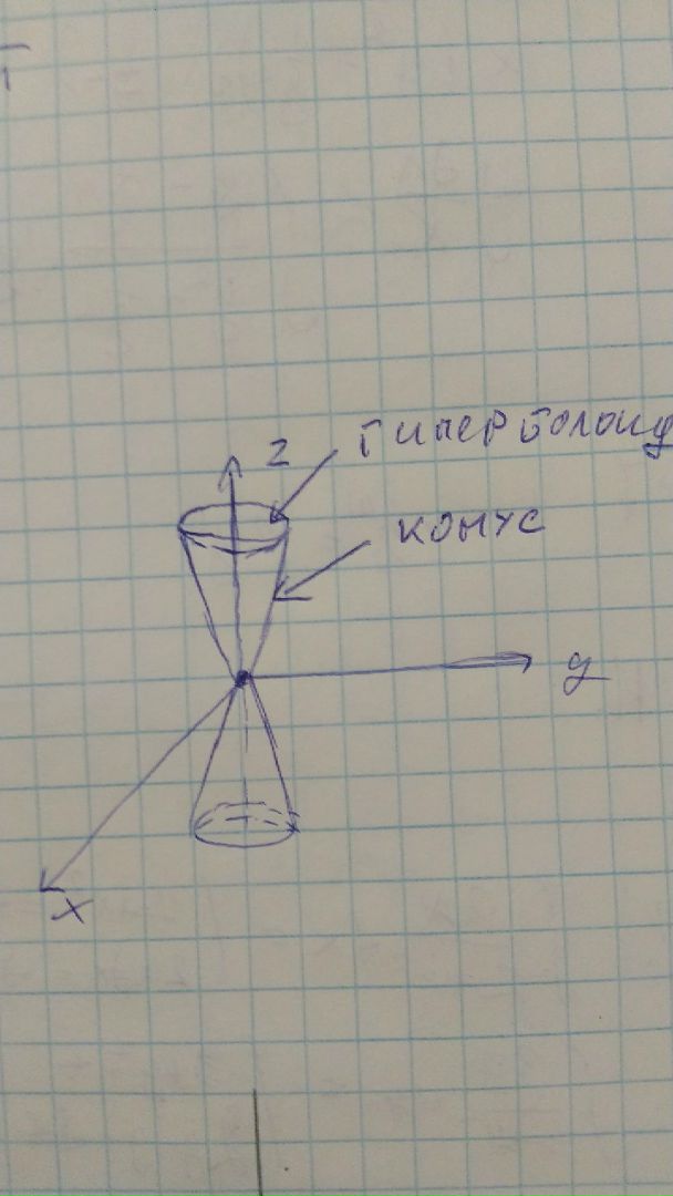 https://pp.userapi.com/c845123... hLIFZs.jpg Я могу увидеть только то, что угол изменяется от 0 до 2pi, остальное для моего разума слишком сложно. Я полагаю, что это, возможно, сумма двух интегралов, но, опять же, не могу понять, что делать с формулами. x^2+y^2-z^2=-a^2 - гиперболоид 2x^2+2y^2-z^2=0 - коническая пов-ть.