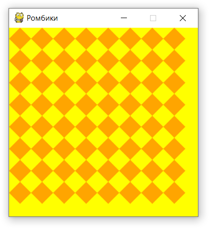 В случае, если пользователь ввел неверное значение (не целое число), программа должна печатать в командную строку сообщение «Неправильный формат ввода» и завершать работу. Обратите внимание: должно быть «покрашено» всё окно, независимо от размера. Неполные ромбики рисоваться не должны. Например, при вводе 35 на окне 300×300 пикселей должно появиться такое изображение: https://yastatic.net/s3/lyceum... hombus.png