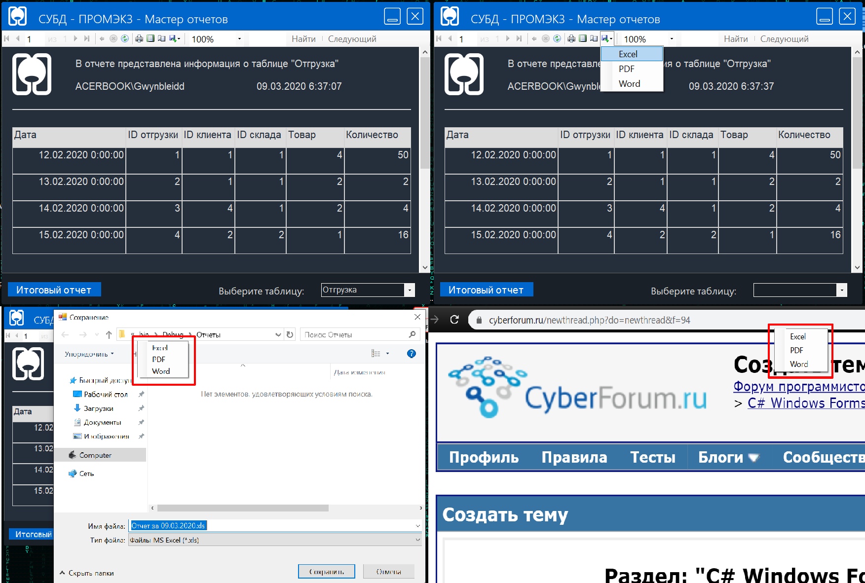 Создал небольшой конструктор отчетов с помощью reportViewer. Стоит задача реализовать сохранение (экспорт) отчета с последующим выводом сохраненных отчетов, например, в listBox (чтобы пользователь мог открыть отчет напрямую из программы, а не искать его вручную). Не нашел способа получить директорию из ReportExport, решил переписать событие полностью (сделал выбор папки по умолчанию, кастомное имя сохраняемого файла (дефолтное событие берет за имя название .rdlc файла) итп) Так вот, проблема в том, что при вызове этого события появляется окно savefiledialog, но открытое контекстное меню таким и остается, накладываясь поверх всех(!) элементов (то есть накладывается оно даже поверх других приложений) По умолчанию сохранение происходит так: выбираем формат в контекстном меню (как и в моем случае), контекстное меню закрывается (предполагал, что связано это со следующим пунктом, но попытки решить это аналогичным образом не удались), возникает небольшая форма внутри reportViewer по типу "Экспорт... [CancelButton]", открывается SaveFileDialog... Нигде в интернете описания подобной проблемы не нашел. Наверняка решается все просто, но я туплю третий час - спать пора идти, наверное Буду признателен за любую помощь и советы, скрин прикрепить не могу - первое сообщение на форуме; прикреплю ссылку, если не удалят (на скрине 1. Общий вид формы 2. Выбор формата сохранения 3. Застывшее контекстное меню 4. Меню поверх всего..): https://sun9-14.userapi.com/c8... OSGYAo.jpg Код переопределенного события: